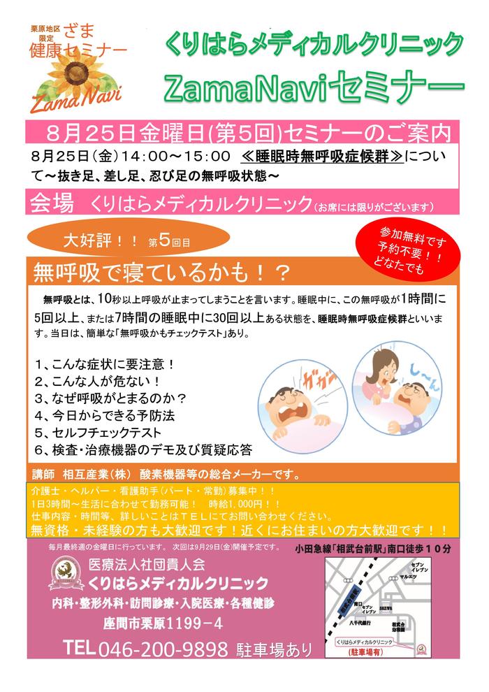 当日は、簡単な「無呼吸かもチェックテスト」を用意しています。どなたでもお気軽にご参加ください。